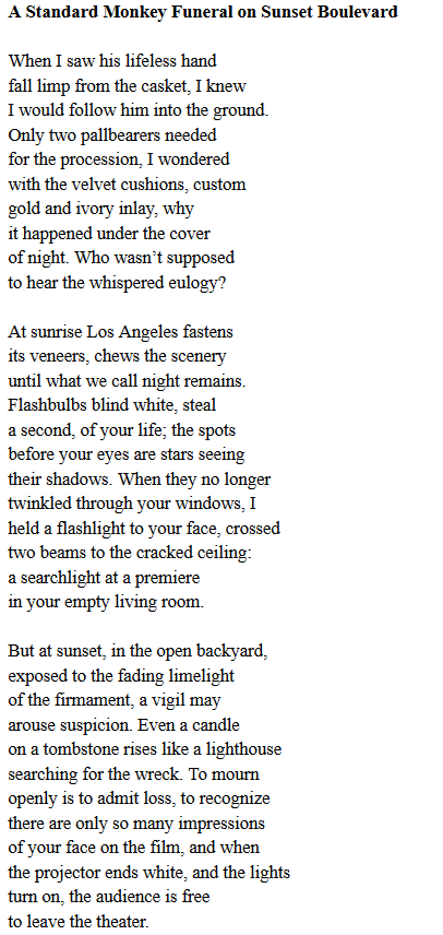 My poem “A Standard Monkey Funeral on Sunset Boulevard” has been published in the Spring 2020 edition of Funicular Magazine. It’s a creative re-imagining of the monkey funeral scene from the beginning of Sunset Boulevard and a meditation on the culture of celebrity and mourning the loss of fame in my hometown of Los Angeles.